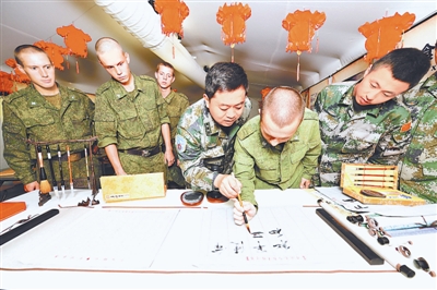 8月7日,中俄官兵交流漢字毛筆書寫方法。在 “和平使命-2013”中俄聯(lián)合反恐軍事演習(xí)野戰(zhàn)兵營一角,設(shè)有“中國傳統(tǒng)文化體驗館”,布設(shè)了中國裱畫、茶道、國畫、京劇臉譜等展區(qū),促進(jìn)了中俄兩軍文化交流。特約記者 譚長俊攝