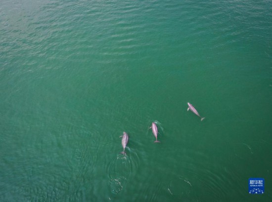 在湖北省宜昌市,長江江豚在水中嬉戲(2021年5月11日攝,無人機照片)。新華社記者 肖藝九 攝