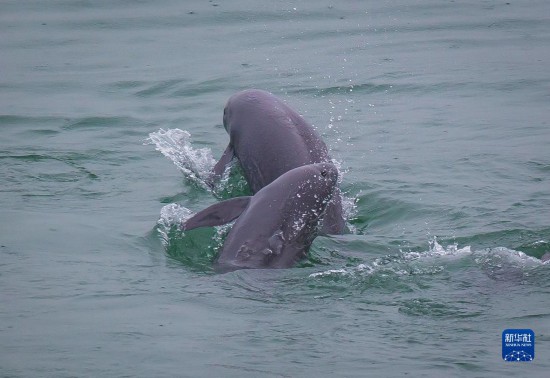 在湖北省宜昌市,長江江豚在水中嬉戲(2021年5月10日攝)。新華社記者 肖藝九 攝