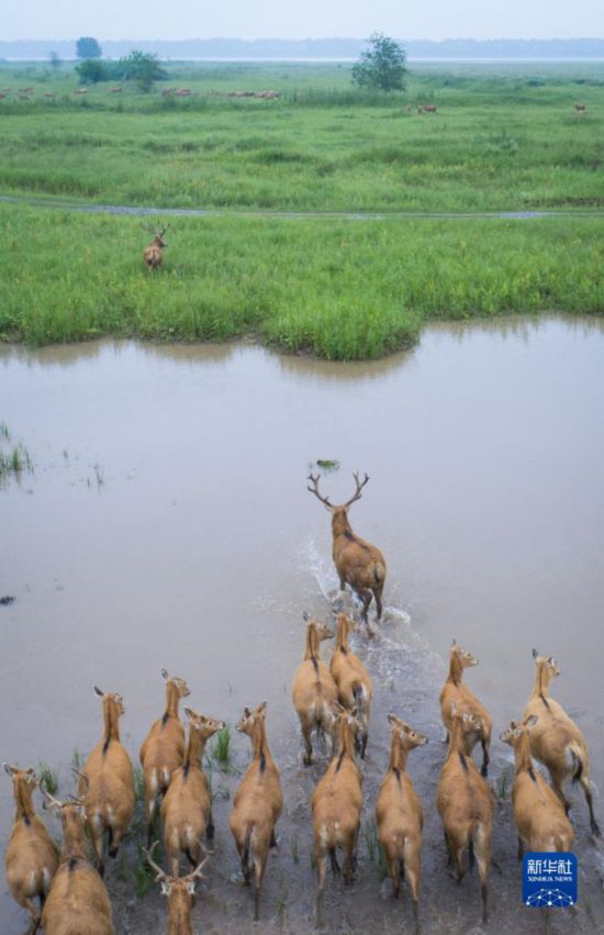 一群麋鹿在石首麋鹿國家級自然保護區(qū)內活動(2021年5月17日攝,無人機照片)。新華社記者 肖藝九 攝