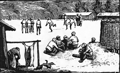 1943年秋,古元隨魯藝慰問(wèn)團(tuán)赴南泥灣三五九旅駐地采風(fēng)。此時(shí)南泥灣因“自己動(dòng)手、豐衣足食”的大生產(chǎn)運(yùn)動(dòng)成為邊區(qū)模范,部隊(duì)“一手持槍、一手務(wù)農(nóng)”的生存模式,成為重點(diǎn)宣傳的典型。古元目睹士兵秋收、練兵、學(xué)習(xí)的場(chǎng)景,產(chǎn)生強(qiáng)烈創(chuàng)作欲望,于是完成了《練兵》這件作品。畫(huà)面描繪了軍營(yíng)前的操場(chǎng)上,士兵有的在訓(xùn)練投擲手榴彈,有的圍坐在一起學(xué)習(xí)討論,還有的在筆記本上做筆記。畫(huà)面左下角有炊事員在忙碌,木架上吊著剛宰殺好的豬,旁邊有雞鴨等家禽。遠(yuǎn)處有一排排整齊的營(yíng)房,兩位首長(zhǎng)模樣的人在交談。畫(huà)面簡(jiǎn)潔明朗、清新自然,正像古元自比的那樣,這是“從人民生活的泉水中釀造出精神的甜蜜”。延安《解放日?qǐng)?bào)》于1943年11月17日刊載了這幅作品,南泥灣精神通過(guò)木刻藝術(shù)形式傳播開(kāi)來(lái)。