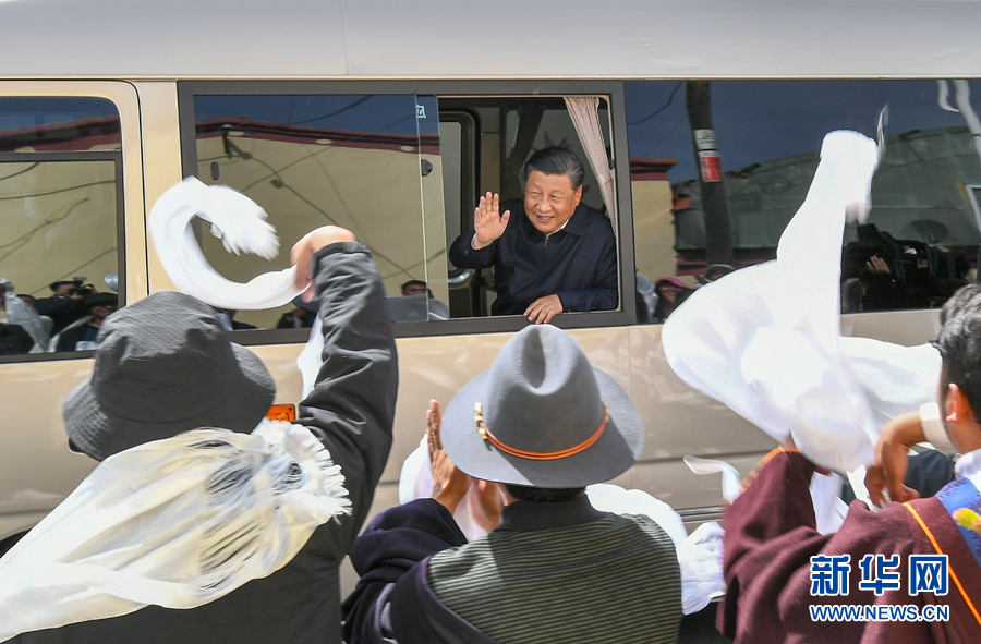 6月7日至9日,中共中央總書記、國家主席、中央軍委主席習近平在青??疾臁_@是8日下午,習近平在海北藏族自治州剛察縣沙柳河鎮(zhèn)果洛藏貢麻村考察時,向村民們揮手致意。新華社記者 謝環(huán)馳 攝