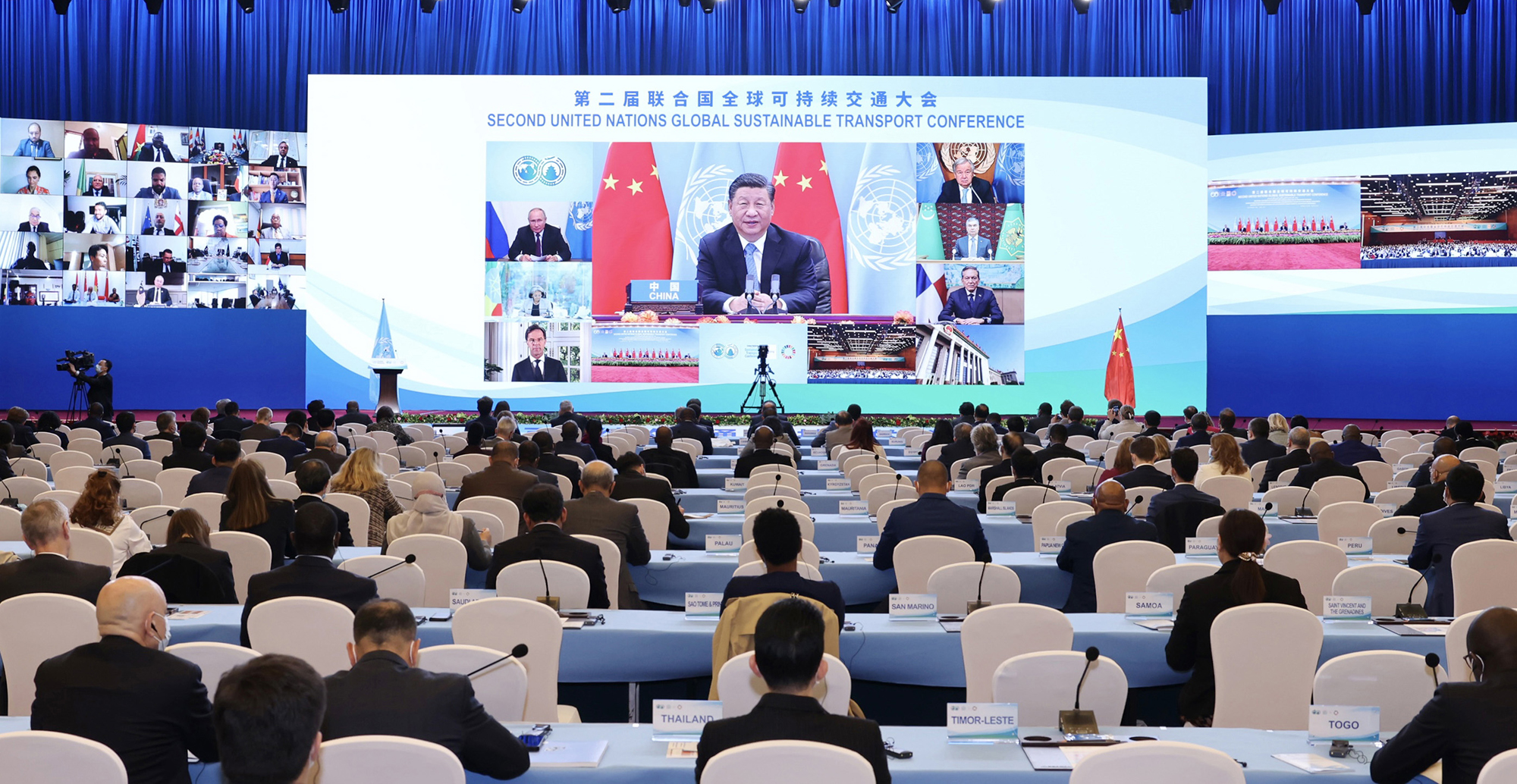 10月14日晚,國(guó)家主席習(xí)近平以視頻方式出席第二屆聯(lián)合國(guó)全球可持續(xù)交通大會(huì)開幕式並發(fā)表題為《與世界相交 與時(shí)代相通 在可持續(xù)發(fā)展道路上闊步前行》的主旨講話。 新華社記者 劉彬 攝