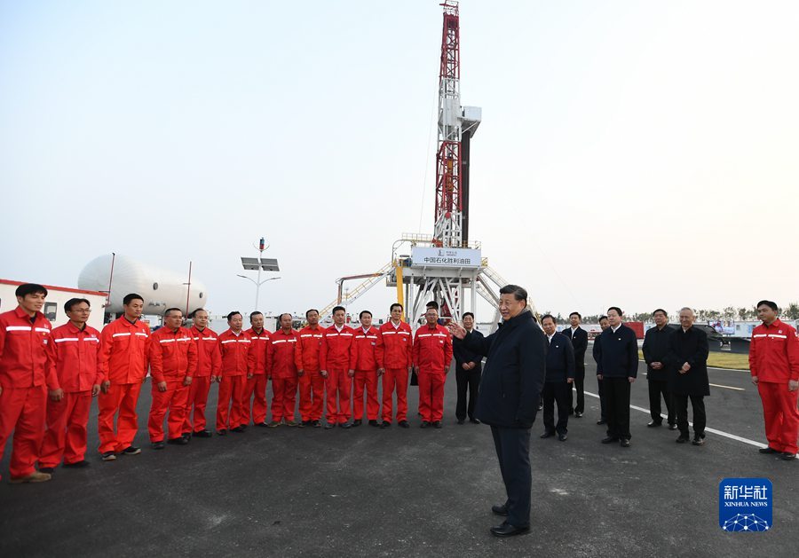 10月22日下午,中共中央總書記、國家主席、中央軍委主席習(xí)近平在山東省濟(jì)南市主持召開深入推動黃河流域生態(tài)保護(hù)和高質(zhì)量發(fā)展座談會並發(fā)表重要講話。這是座談會前,習(xí)近平21日下午在位於東營市萊州灣的勝利油田萊113區(qū)塊考察時,同工人們親切交流。 新華社記者 謝環(huán)馳 攝