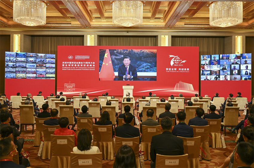 5月18日,國(guó)家主席習(xí)近平在慶祝中國(guó)國(guó)際貿(mào)易促進(jìn)委員會(huì)建會(huì)70周年大會(huì)暨全球貿(mào)易投資促進(jìn)峰會(huì)上發(fā)表視頻致辭。新華社記者 殷博古 攝