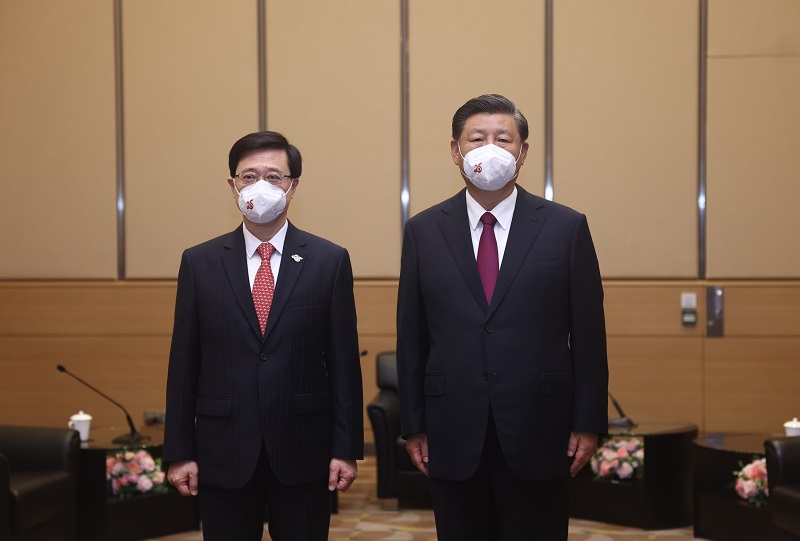 7月1日上午,國家主席習近平在香港會見剛剛就職的香港特別行政區(qū)行政長官李家超。新華社記者 鞠鵬 攝