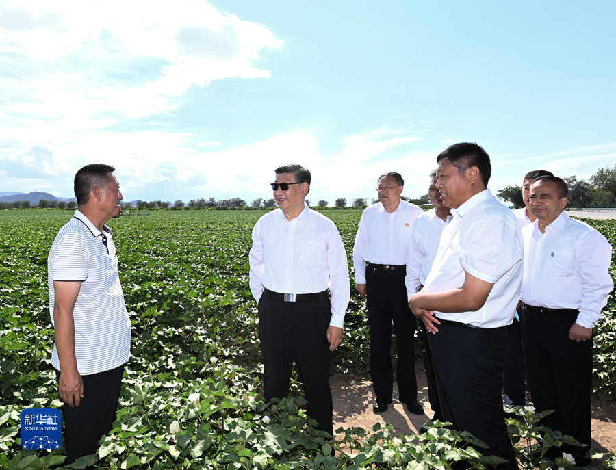 7月12日至15日,中共中央總書記、國家主席、中央軍委主席習(xí)近平在新疆考察。這是13日下午,習(xí)近平在新疆生產(chǎn)建設(shè)兵團(tuán)八師一四三團(tuán)農(nóng)一連棉花種植基地考察。