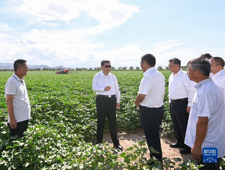 7月12日至15日,中共中央總書記、國(guó)家主席、中央軍委主席習(xí)近平在新疆考察。這是13日下午,習(xí)近平在新疆生產(chǎn)建設(shè)兵團(tuán)八師一四三團(tuán)農(nóng)一連棉花種植基地考察。