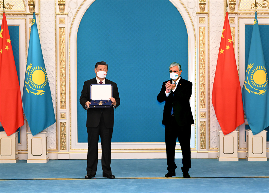 當(dāng)?shù)貢r(shí)間9月14日下午,國(guó)家主席習(xí)近平在努爾蘇丹總統(tǒng)府接受哈薩克斯坦總統(tǒng)托卡耶夫授予“金鷹”勛章。新華社記者 饒愛民 攝