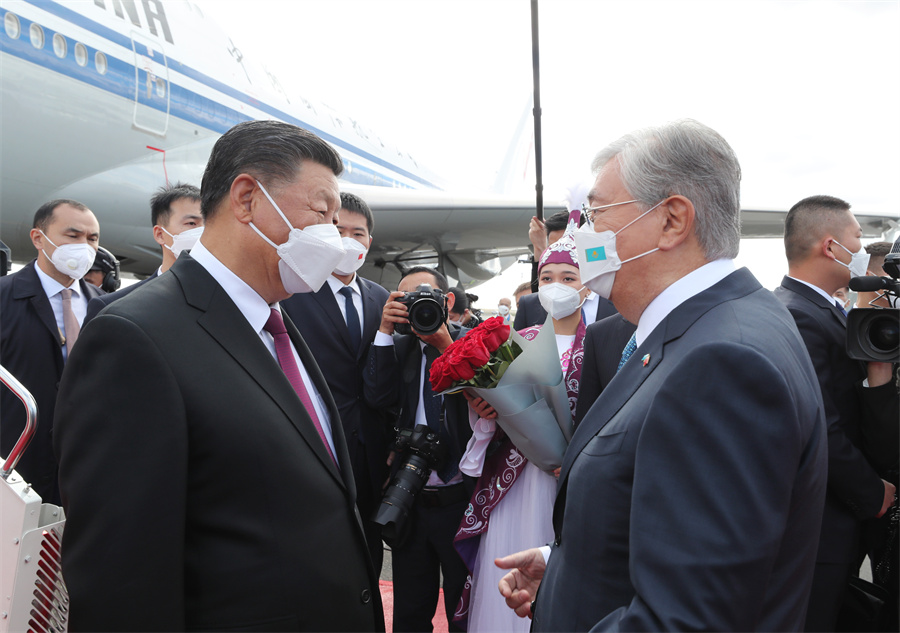 當(dāng)?shù)貢r(shí)間9月14日下午,國(guó)家主席習(xí)近平乘專機(jī)抵達(dá)努爾蘇丹,開始對(duì)哈薩克斯坦共和國(guó)進(jìn)行國(guó)事訪問。這是哈薩克斯坦總統(tǒng)托卡耶夫率政府副總理兼外長(zhǎng)特列烏別爾季、努爾蘇丹市市長(zhǎng)庫(kù)裡吉諾夫等高級(jí)官員在機(jī)場(chǎng)熱情迎接。新華社記者 姚大偉 攝