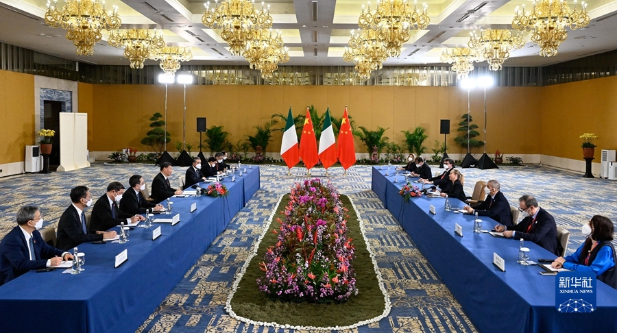 當(dāng)?shù)貢r(shí)間11月16日晚,國家主席習(xí)近平在印度尼西亞巴厘島會(huì)見意大利總理梅洛尼。新華社記者 申宏 攝