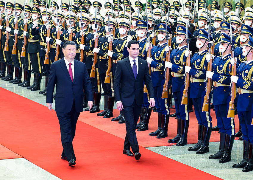 1月6日,國(guó)家主席習(xí)近平在北京人民大會(huì)堂同來(lái)華進(jìn)行國(guó)事訪問(wèn)的土庫(kù)曼斯坦總統(tǒng)謝爾達(dá)爾·別爾德穆哈梅多夫舉行會(huì)談。這是會(huì)談前,習(xí)近平在人民大會(huì)堂北大廳為謝爾達(dá)爾·別爾德穆哈梅多夫舉行歡迎儀式。