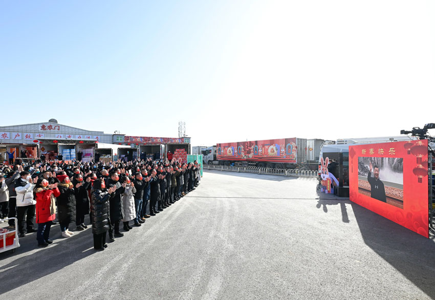1月18日,中共中央總書記、國家主席、中央軍委主席習近平在北京通過視頻連線看望慰問基層干部群眾,向全國各族人民致以新春的美好祝福。這是習近平通過視頻連線,同北京新發(fā)地農(nóng)產(chǎn)品批發(fā)市場的商戶和採購年貨的群眾親切交流。新華社記者 申宏 攝