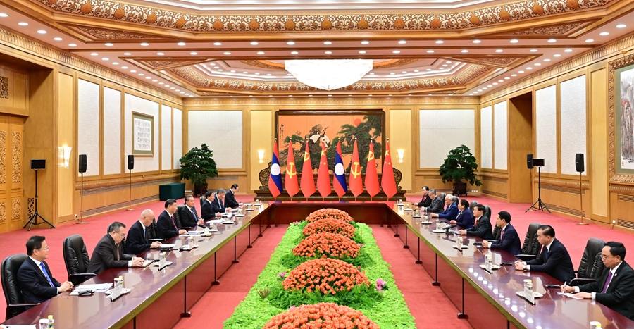 10月20日上午,中共中央總書記、國家主席習(xí)近平在北京人民大會(huì)堂會(huì)見來華出席第三屆“一帶一路”國際合作高峰論壇並進(jìn)行工作訪問的老撾人民革命黨中央總書記、國家主席通倫。