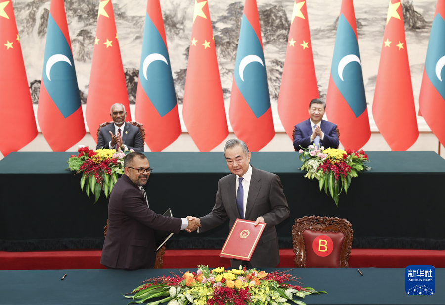 1月10日下午,國(guó)家主席習(xí)近平在北京人民大會(huì)堂同來(lái)華進(jìn)行國(guó)事訪問(wèn)的馬爾代夫總統(tǒng)穆伊茲舉行會(huì)談。這是會(huì)談后,兩國(guó)元首共同見(jiàn)証簽署雙邊合作文件。