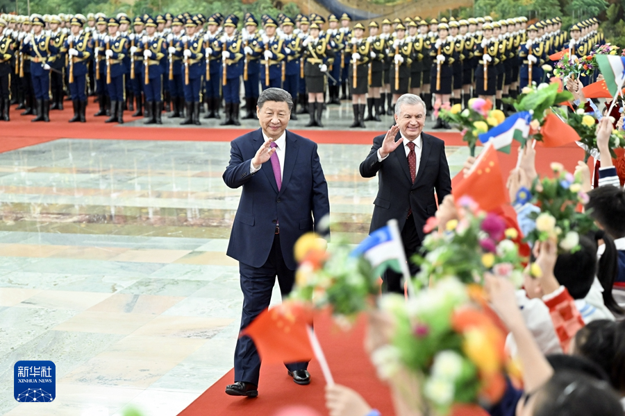 1月24日下午,國家主席習(xí)近平在北京人民大會堂同來華進行國事訪問的烏茲別克斯坦總統(tǒng)米爾濟約耶夫舉行會談。這是會談前,習(xí)近平在人民大會堂北大廳為米爾濟約耶夫舉行歡迎儀式。