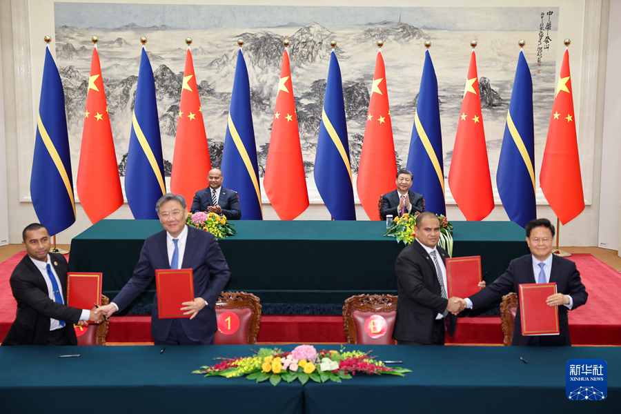 3月25日下午,國家主席習近平在北京人民大會堂同來華進行國事訪問的瑙魯總統(tǒng)阿迪昂舉行會談。這是會談后,兩國元首共同見証簽署共建“一帶一路”、落實全球發(fā)展倡議、經(jīng)濟發(fā)展、農(nóng)業(yè)等領域多項雙邊合作文件。