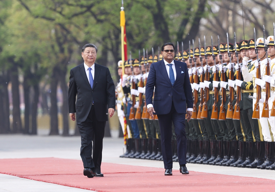 4月12日下午,國家主席習(xí)近平在北京人民大會堂同來華進(jìn)行國事訪問的蘇裡南總統(tǒng)單多吉舉行會談。這是會談前,習(xí)近平在人民大會堂東門外廣場為單多吉舉行歡迎儀式。