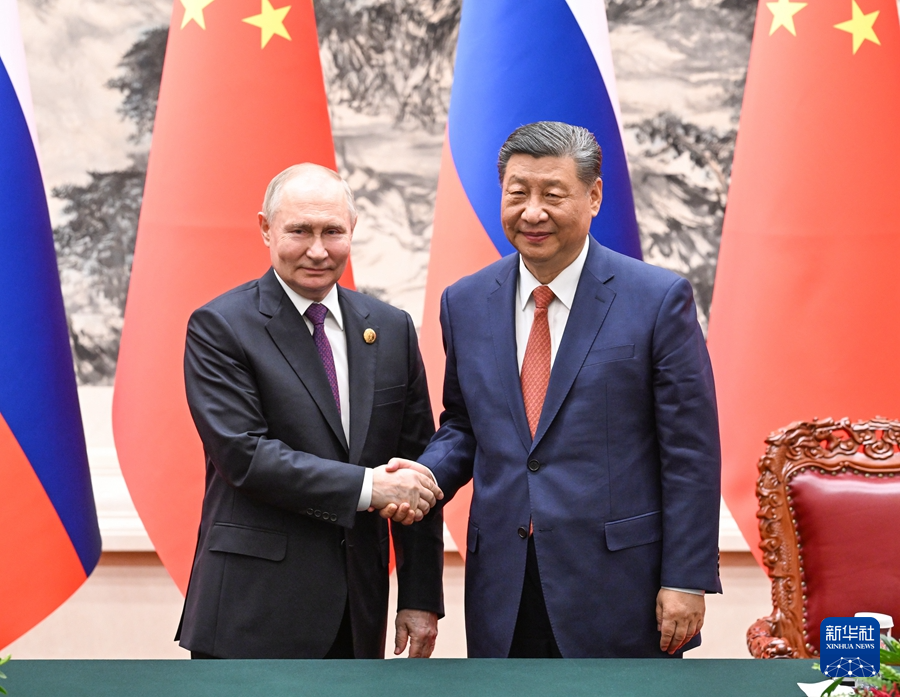 5月16日上午,國家主席習(xí)近平在北京人民大會堂同來華進(jìn)行國事訪問的俄羅斯總統(tǒng)普京舉行會談。會談后,兩國元首共同會見記者。這是習(xí)近平同普京握手。