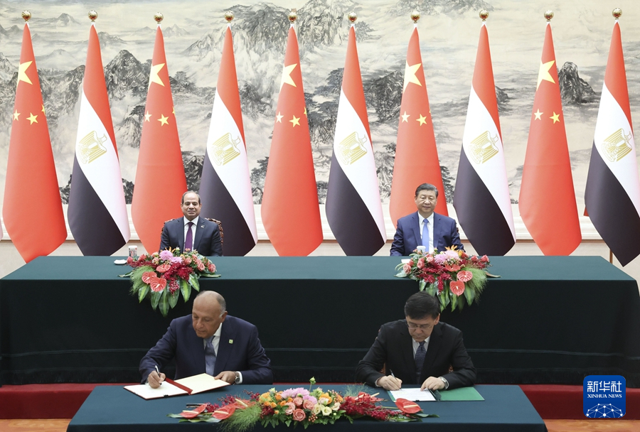 5月29日下午,國(guó)家主席習(xí)近平在北京人民大會(huì)堂同來(lái)華出席中國(guó)-阿拉伯國(guó)家合作論壇第十屆部長(zhǎng)級(jí)會(huì)議開(kāi)幕式並進(jìn)行國(guó)事訪問(wèn)的埃及總統(tǒng)塞西舉行會(huì)談。這是會(huì)談后,兩國(guó)元首共同見(jiàn)証簽署多項(xiàng)雙邊合作文件。