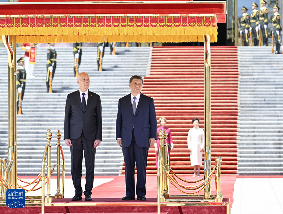 5月31日上午,國家主席習近平在北京人民大會堂同來華國事訪問並出席中國-阿拉伯國家合作論壇第十屆部長級會議開幕式的突尼斯總統(tǒng)賽義德舉行會談。這是會談前,習近平和夫人彭麗媛在人民大會堂東門外廣場為賽義德和夫人伊什拉芙舉行歡迎儀式。