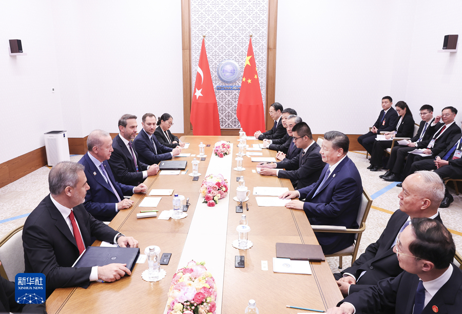 當(dāng)?shù)貢r間7月4日下午,國家主席習(xí)近平在阿斯塔納出席上海合作組織峰會期間會見土耳其總統(tǒng)埃爾多安。