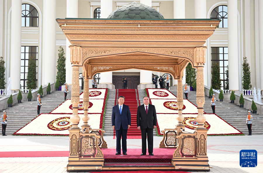 當?shù)貢r間7月5日下午,國家主席習近平同塔吉克斯坦總統(tǒng)拉赫蒙在杜尚別總統(tǒng)府舉行會談。拉赫蒙為習近平舉行盛大隆重的歡迎儀式。