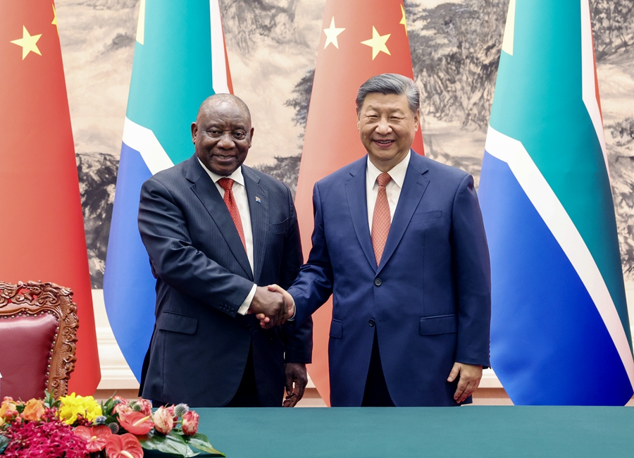 9月2日下午,國家主席習近平在北京人民大會堂同來華出席中非合作論壇北京峰會並進行國事訪問的南非總統(tǒng)拉馬福薩舉行會談。這是會談后,兩國元首共同見証簽署多個雙邊合作文件。