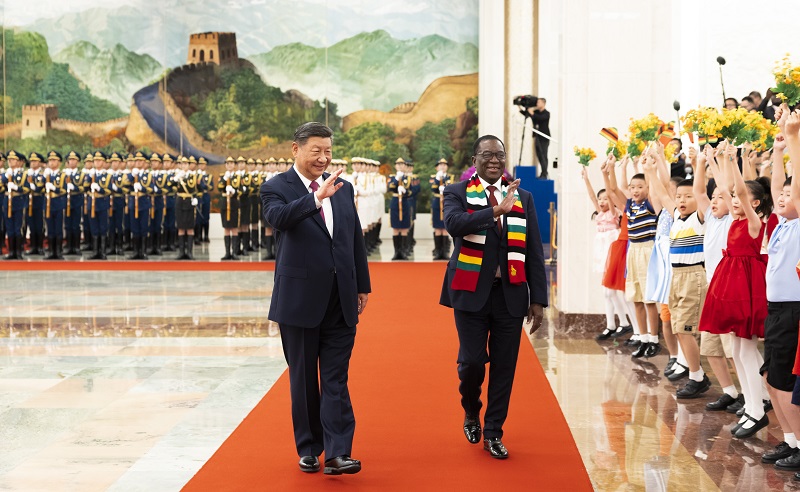 9月3日下午,國家主席習近平在北京人民大會堂同來華出席中非合作論壇北京峰會並進行國事訪問的津巴布韋總統(tǒng)姆南加古瓦舉行會談。這是會談前,習近平在人民大會堂北大廳為姆南加古瓦舉行歡迎儀式。