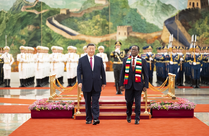 9月3日下午,國(guó)家主席習(xí)近平在北京人民大會(huì)堂同來華出席中非合作論壇北京峰會(huì)並進(jìn)行國(guó)事訪問的津巴布韋總統(tǒng)姆南加古瓦舉行會(huì)談。這是會(huì)談前,習(xí)近平在人民大會(huì)堂北大廳為姆南加古瓦舉行歡迎儀式。