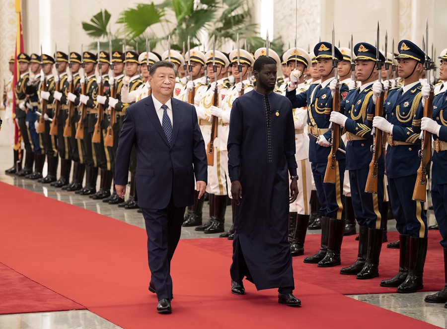 9月4日上午,國家主席習近平在北京人民大會堂同來華出席中非合作論壇北京峰會並進行國事訪問的塞內加爾總統(tǒng)法耶舉行會談。這是會談前,習近平在人民大會堂北大廳為法耶舉行歡迎儀式。