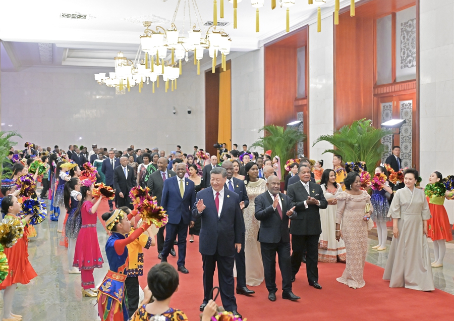 9月4日晚,國(guó)家主席習(xí)近平和夫人彭麗媛在北京人民大會(huì)堂舉行宴會(huì),歡迎來(lái)華出席中非合作論壇北京峰會(huì)的非方及國(guó)際貴賓。這是在前往宴會(huì)廳沿途,少年兒童對(duì)國(guó)際貴賓表示熱烈歡迎。