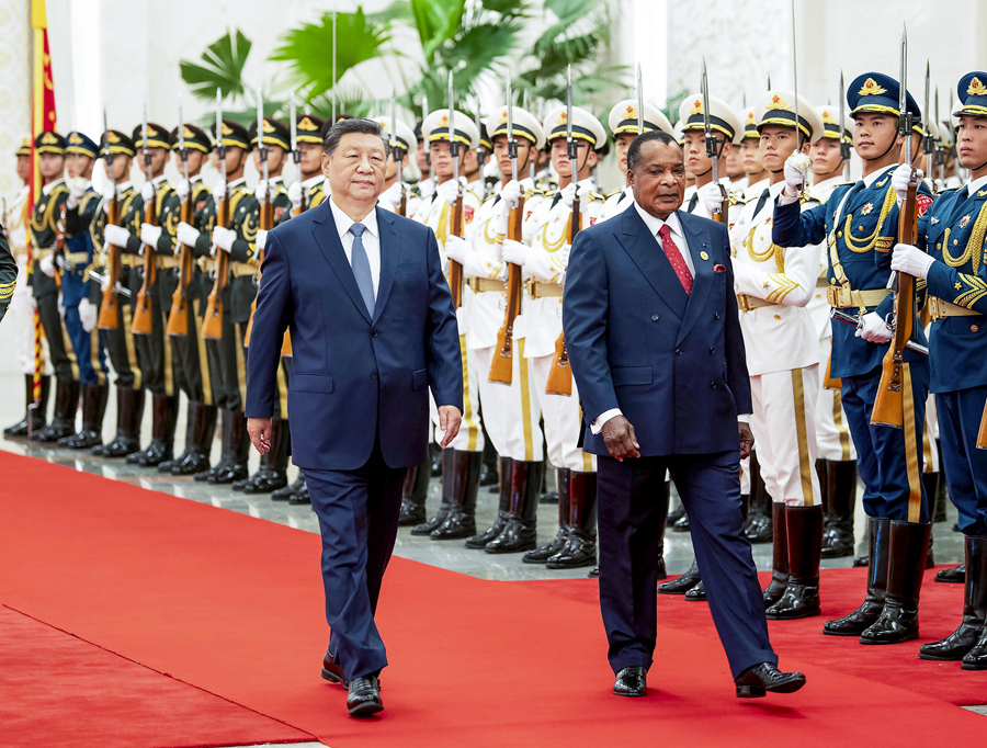 9月6日上午,國(guó)家主席習(xí)近平在北京人民大會(huì)堂同來華出席中非合作論壇北京峰會(huì)並進(jìn)行國(guó)事訪問的剛果(布)總統(tǒng)薩蘇舉行會(huì)談。這是會(huì)談前,習(xí)近平在人民大會(huì)堂北大廳為薩蘇舉行歡迎儀式。
