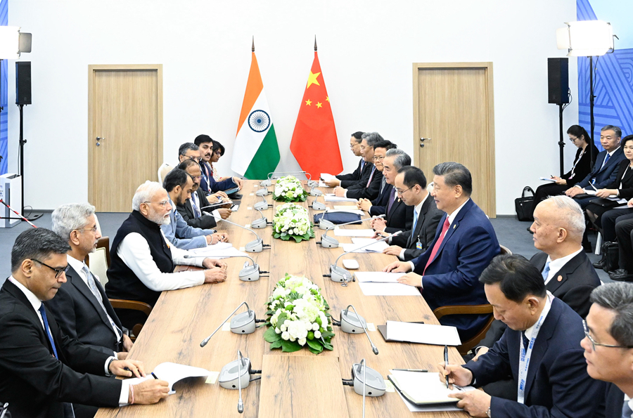 當地時間10月23日,國家主席習近平在喀山出席金磚國家領導人會晤期間會見印度總理莫迪。