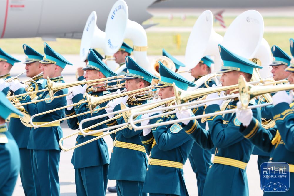 身著盛裝的哈薩克斯坦女青年向習近平獻花。禮兵分列藍地毯兩側致敬,哈薩克斯坦少年兒童手持中哈兩國國旗熱烈歡迎習近平到訪。