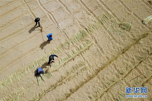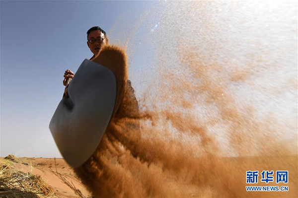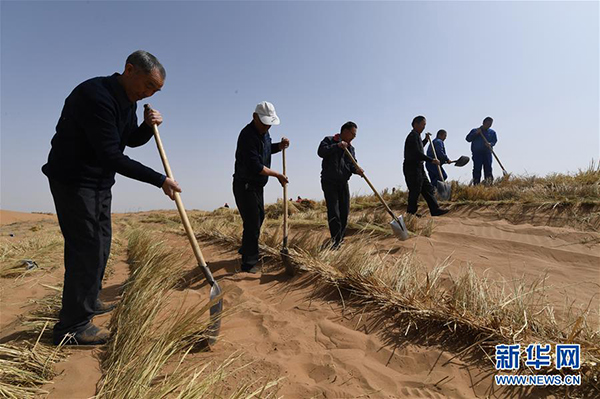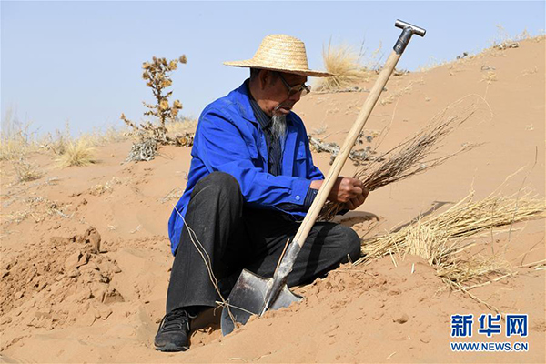 在甘肅省古浪縣境內(nèi)的黑崗沙風(fēng)沙口,八步沙第二代治沙人用稻草壓沙(3月26日攝)。新華社記者范培珅 攝