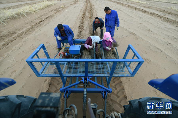 在甘肅省古浪縣黃花灘移民區(qū),八步沙第二代治沙人和村民一起使用梭梭肉蓯蓉種植一體機(jī)種植梭梭嫁接肉蓯蓉(3月26日攝)。 新華社記者范培珅 攝