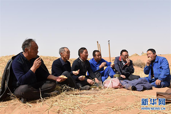 在甘肅省古浪縣境內(nèi)的黑崗沙風(fēng)沙口,八步沙第二代治沙人賀中強(qiáng)(左一)、郭萬(wàn)剛(左二)、石銀山(左三)、羅興全(右三)、程生學(xué)(右二)、王志鵬(右一)在休息間隙吃午飯(3月26日攝)。 新華社記者范培珅 攝