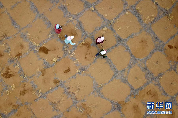 在甘肅省古浪縣境內(nèi)的黑崗沙風(fēng)沙口,八步沙第二代治沙人在沙漠中壓沙治沙(3月26日無(wú)人機(jī)拍攝)。新華社記者范培珅 攝