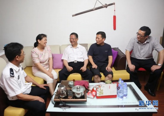 2016年6月29日,潘東升局長(zhǎng)(中)到刑偵支隊(duì)民警家中慰問(wèn)。新華網(wǎng)發(fā)(福州市公安局供圖)