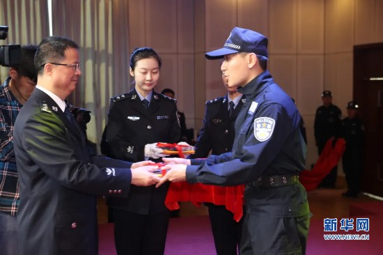2017年4月28日上午,潘東升局長(zhǎng)(左一)在2016年度民警榮譽(yù)儀式上為新警授銜。 新華網(wǎng)發(fā)(福州市公安局供圖)
