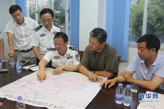 2016年7月12日,潘東升局長(zhǎng)(左二)在閩清指導(dǎo)防抗臺(tái)風(fēng)“尼伯特”。新華網(wǎng)發(fā)(福州市公安局供圖)