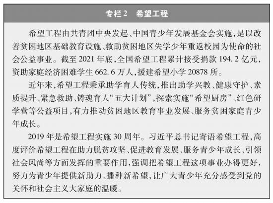 教育機(jī)會更加均等。中國教育事業(yè)優(yōu)先發(fā)展不斷深化,中國青年享有更加平等、更高質(zhì)量的教育機(jī)會。2021年,中國義務(wù)教育鞏固率達(dá)95.4%;高中階段毛入學(xué)率達(dá)91.4%;高等教育毛入學(xué)率達(dá)57.8%、在學(xué)總規(guī)模達(dá)4430萬人,居世界第一,越來越多的青年打開了通往成功成才大門的重要路徑。覆蓋學(xué)前教育至研究生教育的學(xué)生資助政策體系建成且日趨完善,2020年資助資金總額超過2400億元、資助學(xué)生近1.5億人次,實(shí)現(xiàn)“三個(gè)全覆蓋”②。義務(wù)教育階段進(jìn)城務(wù)工人員隨遷子女、農(nóng)村和貧困地區(qū)學(xué)生等群體受教育權(quán)益得到充分保障。2020年,85.8%的進(jìn)城務(wù)工人員隨遷子女在公辦學(xué)校就讀或享受政府購買學(xué)位服務(wù);2012年至2021年,農(nóng)村和貧困地區(qū)重點(diǎn)高校專項(xiàng)招生計(jì)劃定向招生超過82萬人,讓更多的青年公平享有接受更好教育的機(jī)會,阻斷貧困的代際傳遞。
