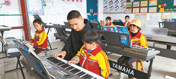“我會教他們認(rèn)樂譜、怎么卡節(jié)奏、唱什么聲部,經(jīng)過長期堅持學(xué)習(xí),孩子們進步很快!敝艿猛呏笇(dǎo)學(xué)生彈奏電子琴的指法,邊笑著和我們聊到,自從2017年,學(xué)校配備了專門的音樂教室,每堂課他都會堅持使用樂器,以此來培養(yǎng)孩子們的音樂素養(yǎng),效果非常不錯。