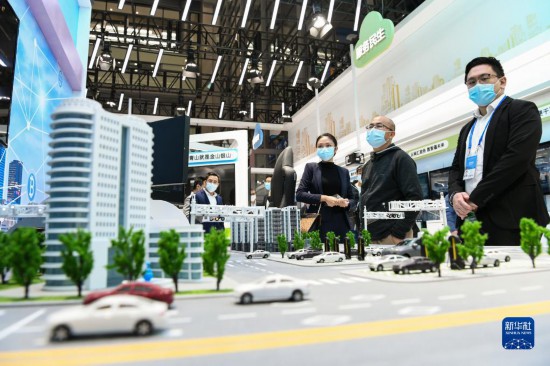 在深圳舉行的第二十三屆中國國際高新技術(shù)成果交易會智慧城市展區(qū),觀眾了解華為智能網(wǎng)聯(lián)(2021年12月27日攝)。新華社記者 梁旭 攝