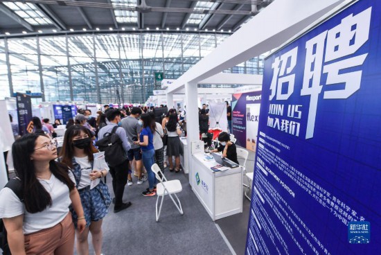 在深圳舉行的中國國際人才交流大會海歸人才招聘會上,求職人員查看招聘信息(2021年4月24日攝)。新華社記者 毛思倩 攝