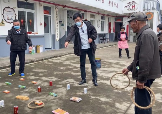 支老人員(左一、左二)組織柴山島白沙港村托老所老人們玩套圈游戲。新華社記者黃筱攝