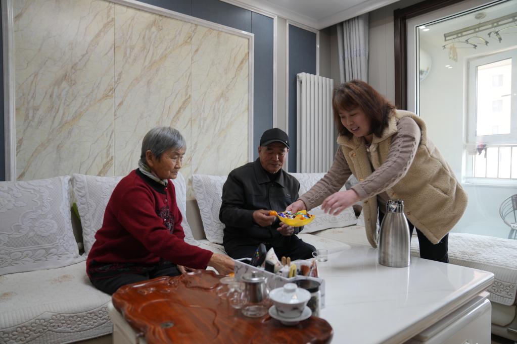 濟(jì)南市長(zhǎng)清區(qū)孝里街道居民于家云(中)、朱存紅夫婦和兒媳婦安風(fēng)芹(右)在遷入的新居中。新華社記者朱崢攝