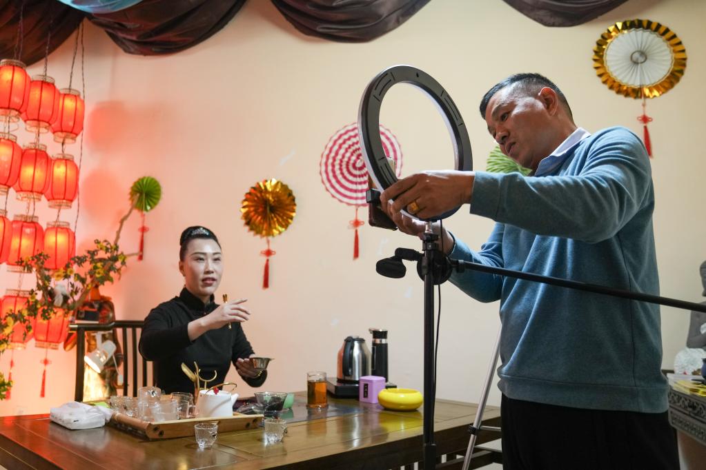 濟(jì)南市長(zhǎng)清區(qū)孝里街道居民馮辛華(右)、徐金玉夫婦在自己經(jīng)營(yíng)的茶葉店里準(zhǔn)備直播。新華社記者朱崢攝