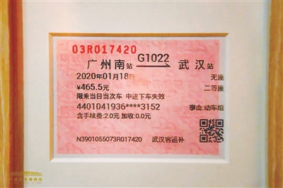 在展覽中,有一張紅色高鐵票:2020年1月18日,高鐵,廣州南開往武漢,票價是465.5元。從車票上公開的部分身份證信息,可以看到乘車人出生于1936年。車票上有個細節(jié):無座、二等座,也就是說這是一張緊急上車后補的車票。這一張高鐵票上的信息,足以講述一個驚心動魄的故事,一個老共產(chǎn)黨員的逆行故事。